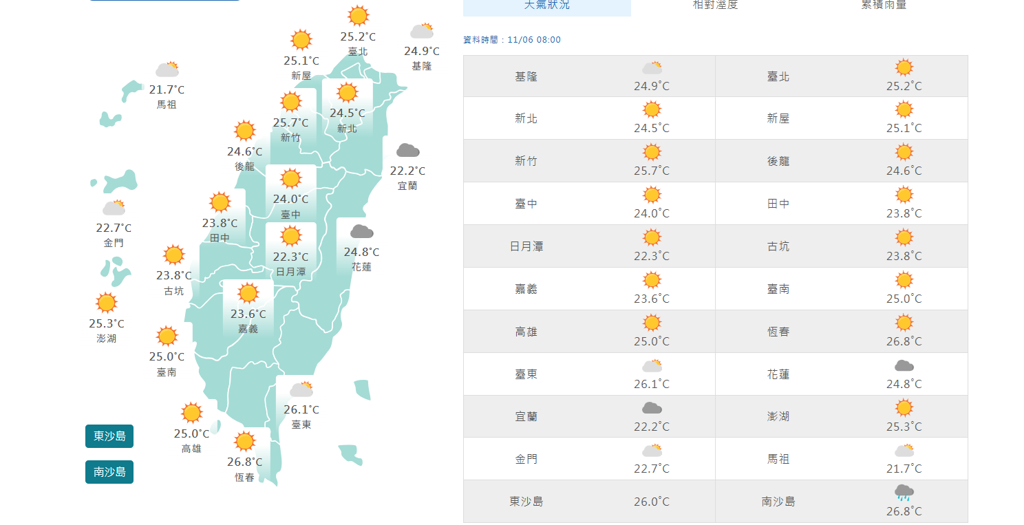 離島天氣方面,澎湖晴時多雲,24至26℃;金門晴時多雲,21至26℃;馬祖多雲時晴,19至23℃。
