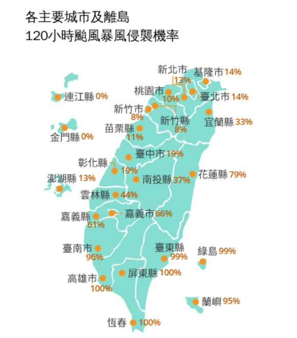 根據氣象署公布「未來120小時暴風侵襲機率」,超過50%的縣市分別為屏東縣100%、高雄市100%、台東縣99%、台南市96%、花蓮縣79%、嘉義市66%、嘉義縣61%。