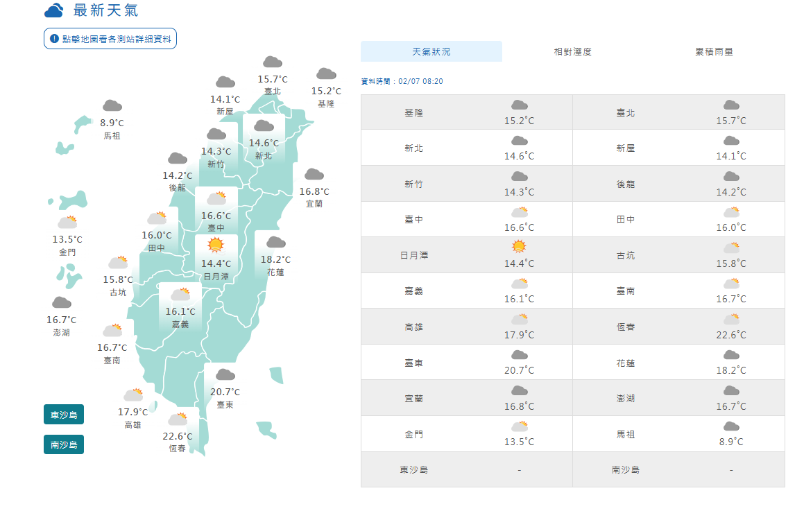 明(2/8)日寒流持續影響,各地非常寒冷。降雨範圍縮小,桃園以北、東半部、恆春半島與西半部山區有零星短暫雨,其餘地區及離島多雲到晴;清晨南部仍可能有零星降雨。8日至9日清晨寒流最強,部分地區持續出現10度左右或以下低溫的機率升高,請注意防範。