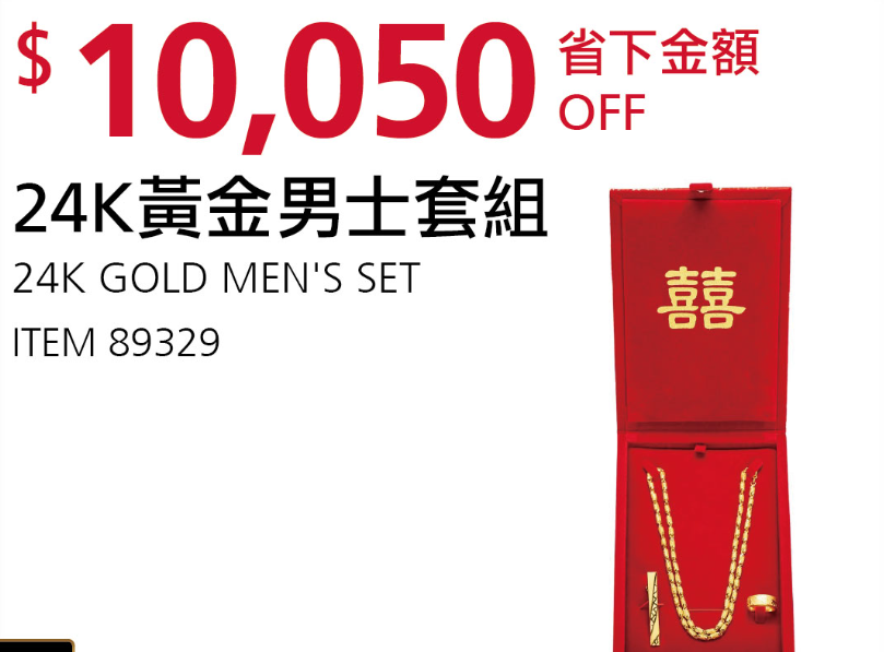 明天(11/28)推出的優惠,包括精品的「24K黃金男士套組」,折10050元。「0.5克拉鑽石項鍊」,折7500元,可供準備結婚的新人選購。