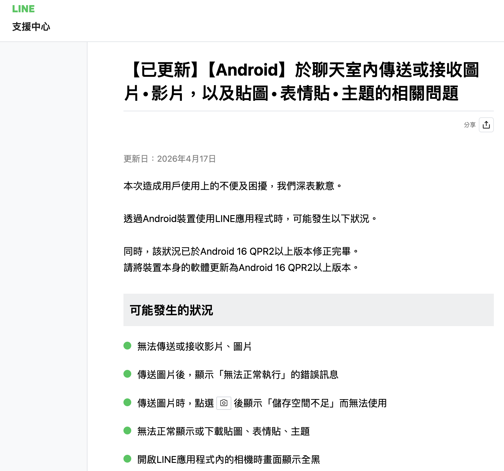 LINE官方公告指出,安卓裝置近期在使用LINE時可能發生,聊天室內無法傳送或接收影片、圖片,傳送圖片後,顯示「無法正常執行」的錯誤訊息,以及傳送圖片時,點選相機圖示後顯示「儲存空間不足」而無法使用,無法正常顯示或下載貼圖、表情貼、主題,甚至開啟LINE應用程式內的相機時畫面顯示全黑。官方表示,造成用戶使用上的不便及困擾,深表歉意。目前狀況已修正完畢,請安卓用戶將裝置本身的軟體更新為Android 16 QPR2以上版本。