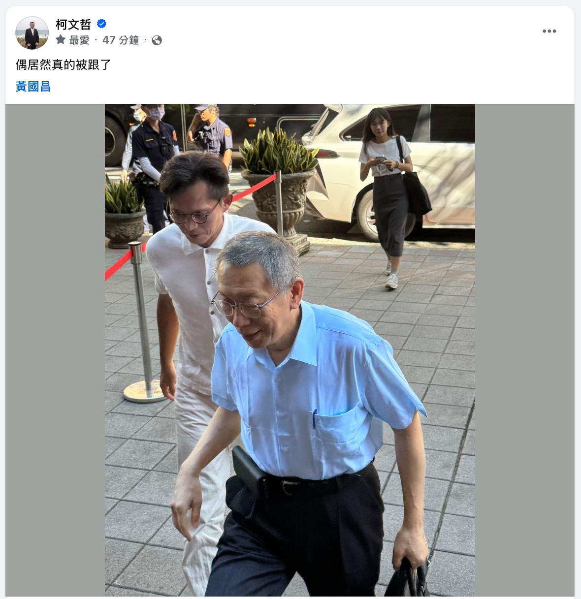 民眾黨主席黃國昌近日深陷養狗仔集團跟監政敵疑雲,外界質疑連民眾黨前主席柯文哲都被跟監。柯文哲今(10/2)出庭,上午在臉書貼出照片,只見黃國昌跟在他身後,柯打趣稱「偶(我)居然真的被跟了」,並tag黃國昌。