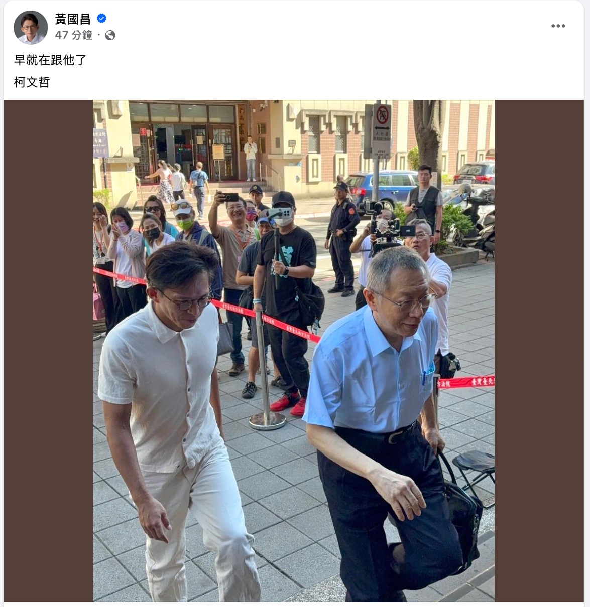 黃國昌也在臉書貼出兩人同框照,寫下「早就跟他了」,也tag柯文哲。隔空呼應柯文哲貼文,破除外界謠言。