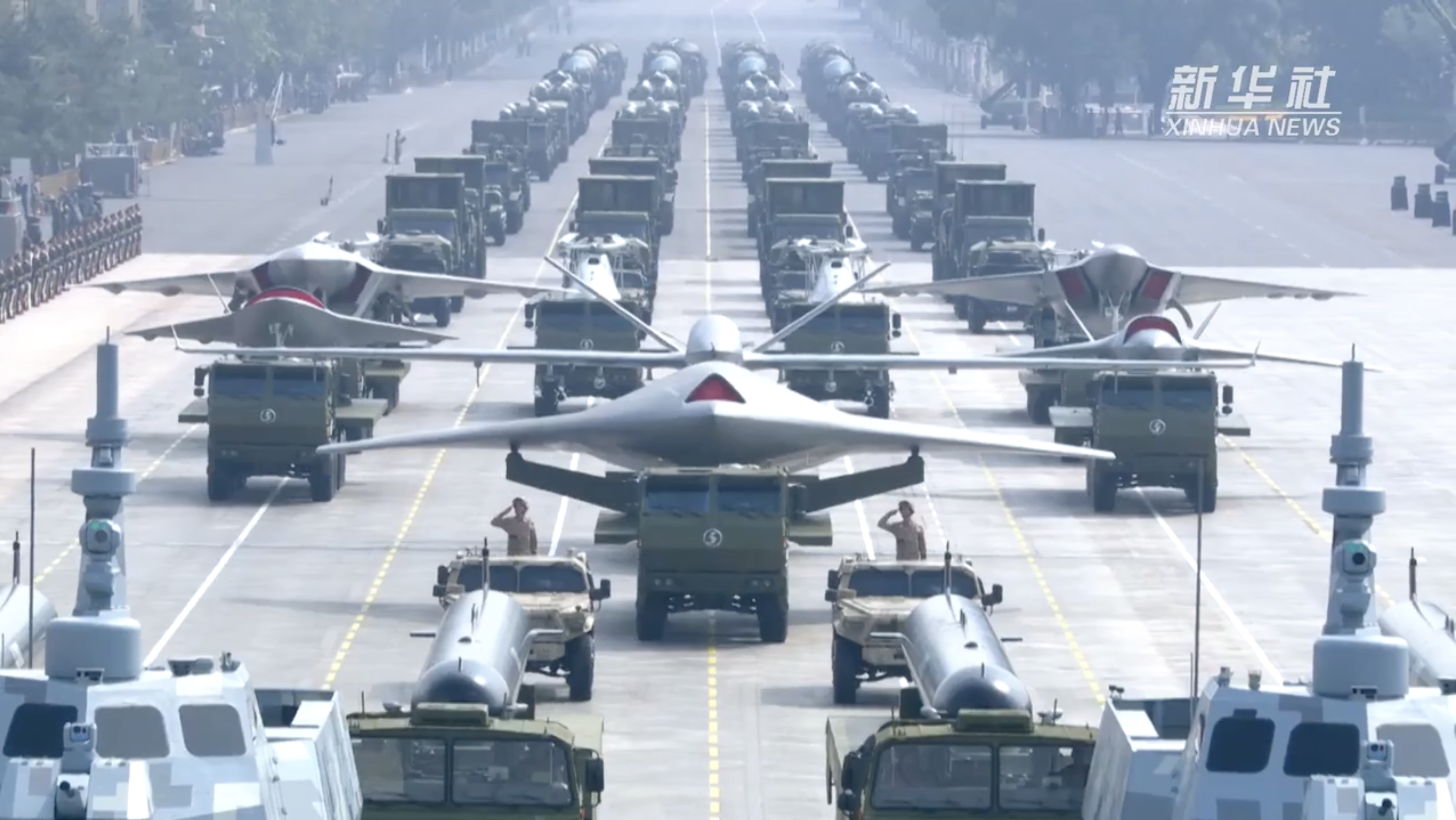 中國93閱兵,2025.9.3展出包括被稱為「忠誠僚機」的攻擊-11型大型無人機(中前)、偵打一體無人機,在無人機梯隊後方也有4種不同類型的無人機,外界研判可能為「忠誠僚機」。截自新華網