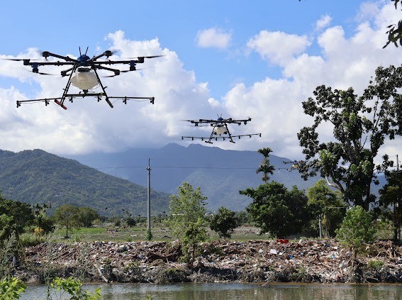 國軍協助花蓮災區復原的衛生安全,由民間無人機結合陸軍化學兵調製消毒藥劑進行大範圍噴灑消毒。國防部