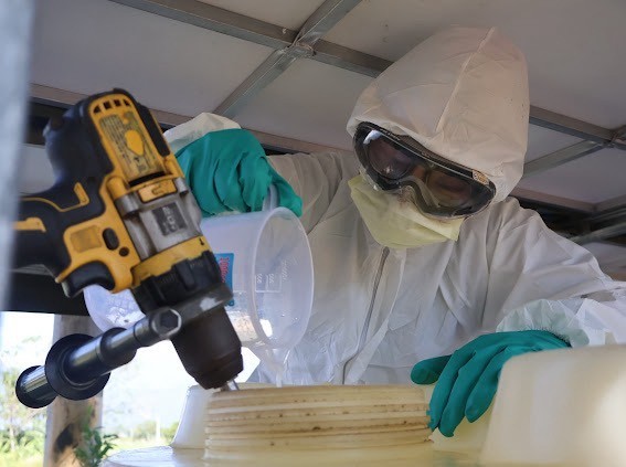 陸軍化學兵33化兵群官兵調製消毒藥劑,準備以無人機噴灑清消。國防部