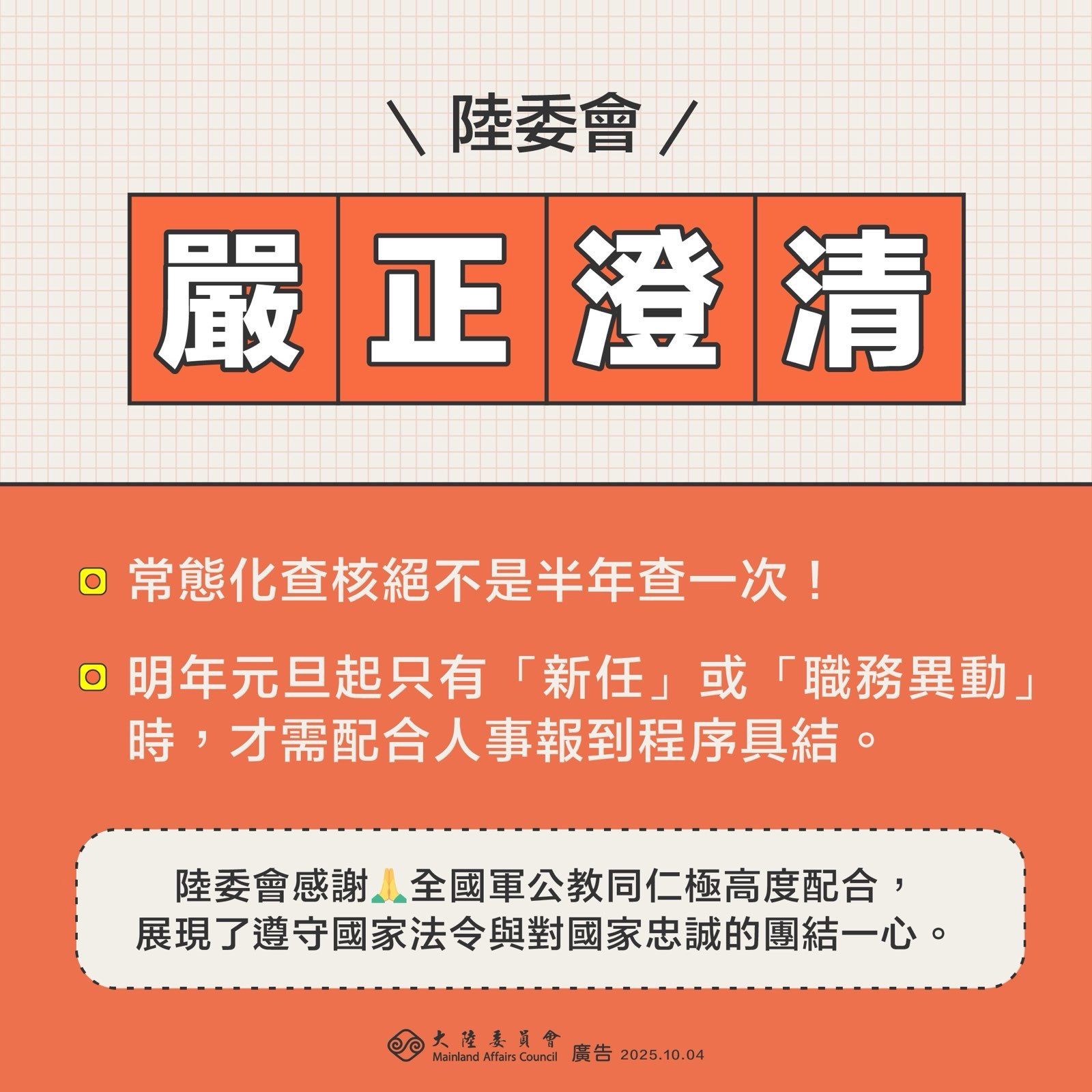 大陸委員會今天(10/04)表示,部分媒體及人士混淆視聽,對外散佈政府未來每半年要清查一次軍公教是否申領持有中共戶籍、身分證、護照、定居證、居住證等假訊息,企圖製造軍公教系統內部不安,挑動對立。政府提出嚴正澄清,自明年元旦起實施的常態化清查,只有在新任或職務異動時,才需配合人事單位填寫調查具結書,從來都沒有每半年就要查核一次的規劃。