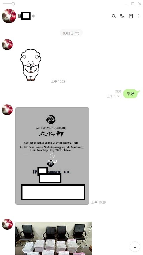 民眾黨立委黃國昌分享2025年9月2日辦公室人員與文化部國會聯絡人的對話截圖。黃國昌國會辦公室提供。
