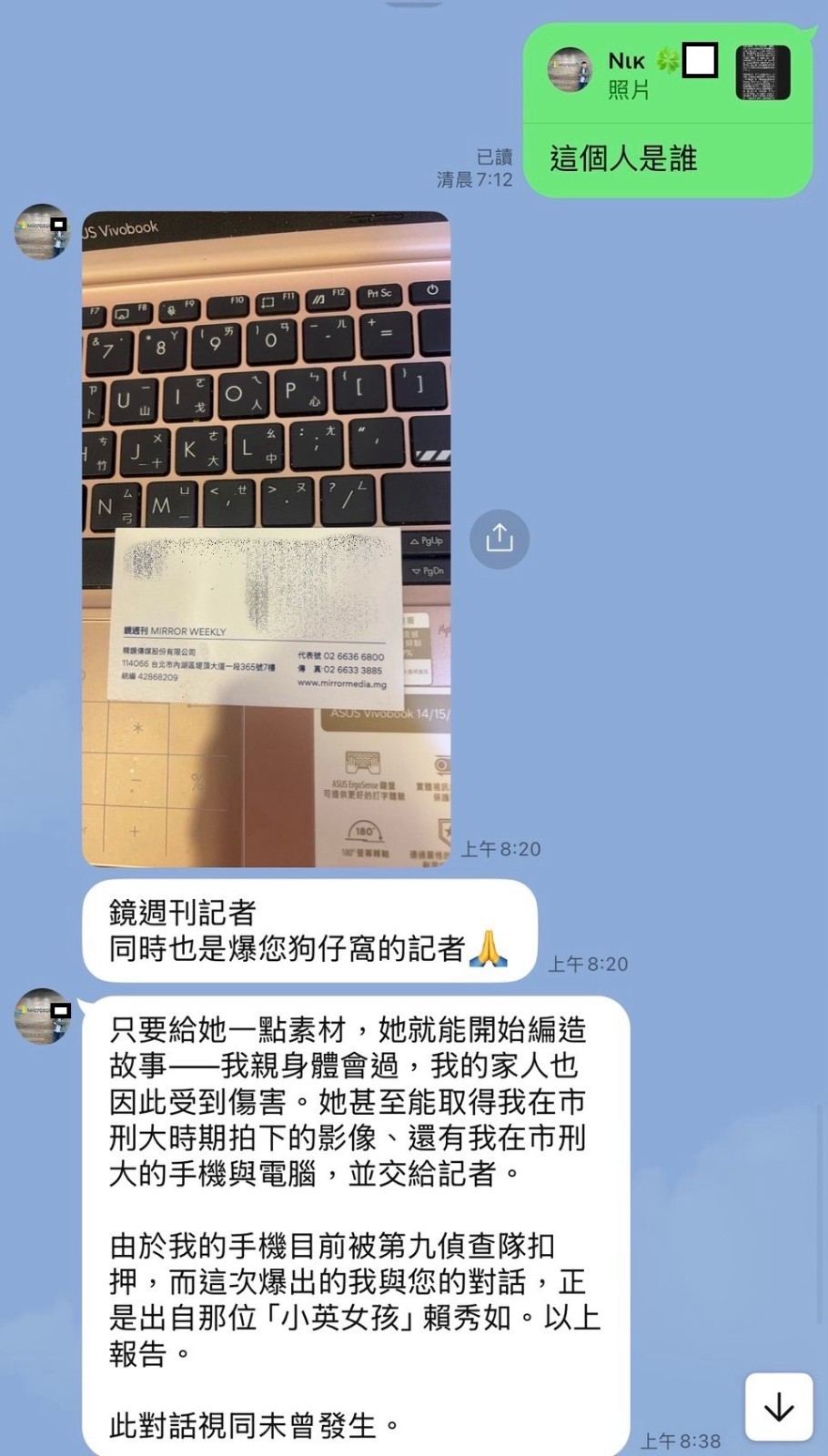 今天吳姓工程師再貼出一張《鏡週刊》記者名片,向黃國昌控訴該記者「只要給她一點素材,她就能開始編造故事。我親身體會過,我的家人也因此受到傷害。她甚至能取得我在市刑大時期拍下的影像、還有我在市刑大的手機與電腦,並交給記者。由於我的手機目前被第九偵查隊扣押,而這次爆出的我與您的對話,正是出自那位「小英女孩」賴秀如。以上報告。此對話視同未曾發生。」