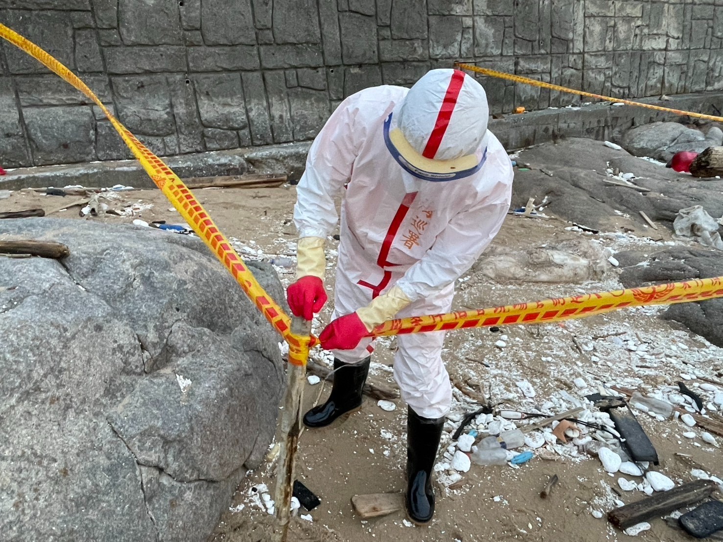 海巡署金馬澎分署馬祖岸巡隊2025.10.23接獲通報馬祖北竿芹壁沙灘發現疑似死亡豬隻,立即調派巡邏人員前往應處封鎖管制,防堵非洲豬瘟進入國門。海巡署提供