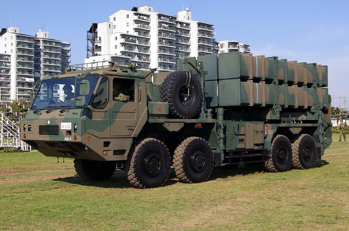 日本陸上自衛隊新型防空飛彈「「03式防空飛彈」(漢字為『03式中距離地対空誘導弾』發射車,隸屬於高射教導隊。照片作者:Los688/維基百科