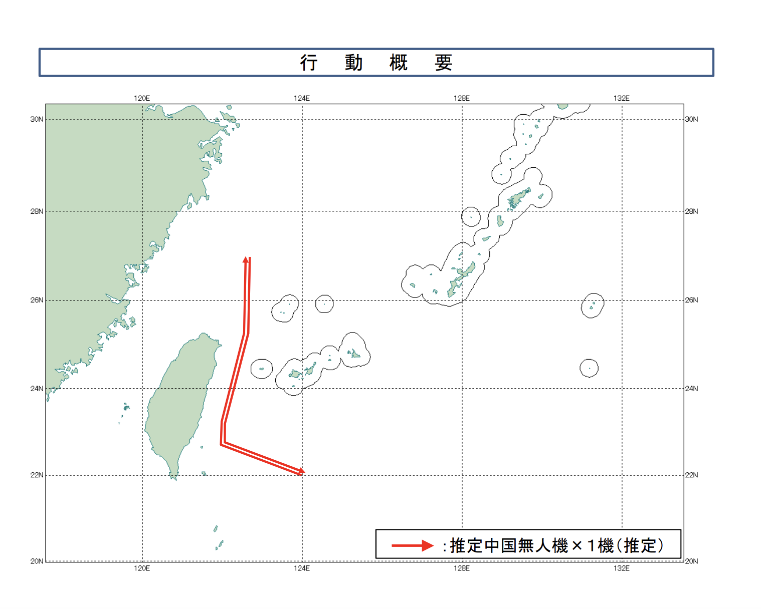 日本防衛省統合幕僚監部2025.11.25公布疑似一架中國無人機穿越與那國島與台灣之間的空域,航跡顯示由北向南飛行後並折返。日方並派戰鬥機緊急起飛前往應對。日本防衛省網站