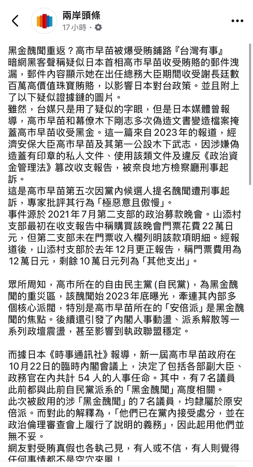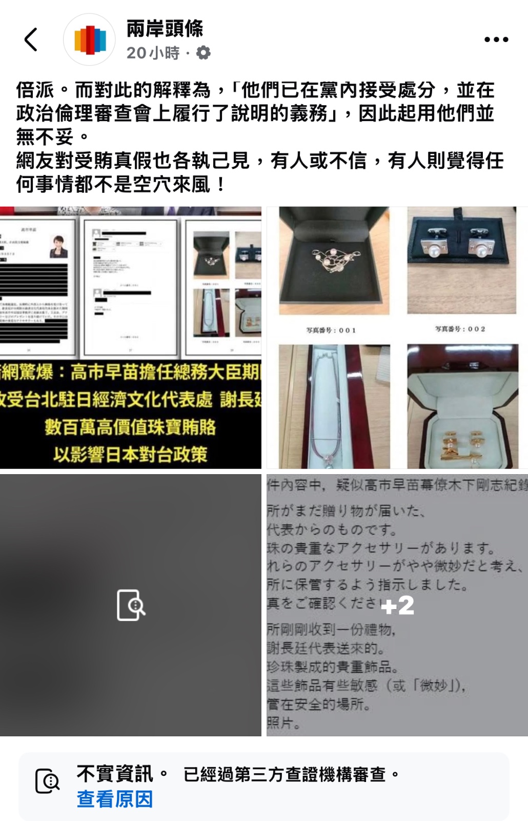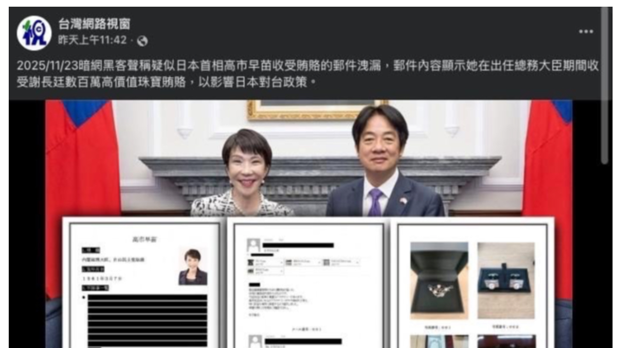 國安單位掌握中國網軍於暗網發文誣指日本首相高市早苗「收賄」,由臉書轉傳,再由中國官媒「香港文匯報」刊登企圖「洗白」成為正式新聞報導,混淆視聽。截自臉書