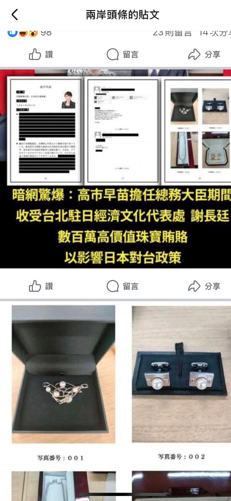 國安人士表示,該暗網貼文中,以假造的「⽇本政府要人非公開不祥事報告書」,指控日本首相高市早苗擔任眾議員時,以email要求幕僚「保管」台灣駐日代表謝長廷贈送的珍珠、黃金等高價首飾。