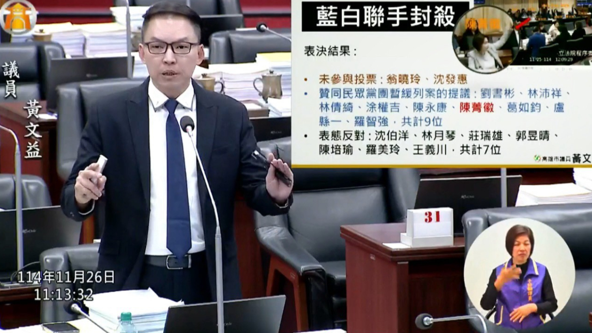 財劃法爭議延燒,民進黨高市議員黃文益今(11/26)痛批,行政院版本最能反映高雄實際負擔,卻遭藍白封殺,讓高雄連進入討論程序的機會都沒有。他點名國民黨立委柯志恩、陳菁徽明明能為高雄爭取權益,卻選擇阻擋,「真正拖垮高雄的人,就是你們。」