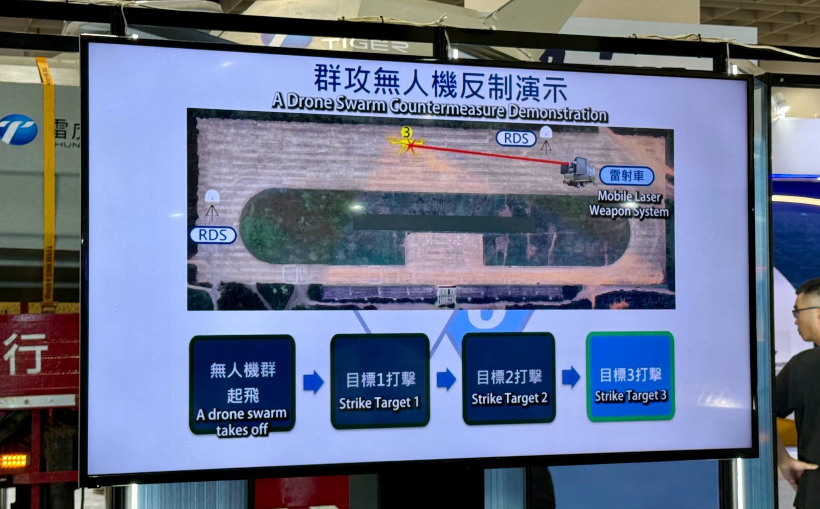 另外,漢翔公司當時也在台北航太展同場較勁,展出國內雷射科技大廠的合作成果,展位上放置了距離125公尺,以 8KW功率的高能雷射燒穿 4mm 厚度的鋼板。漢翔公司並指出,在雷射「硬殺」系統設定的2公里有效距離外,該公司的反制無人機是採取電子「軟殺」反制無人機。敵方無人機若後續進入2公里射程內,雷射「硬殺」系統就會啟動反制擊落無人機。