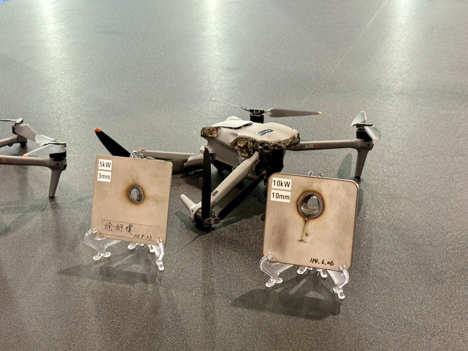 台北國際航太暨國防工業展國防館,中科院首度展出高能雷射武器針對(蜂群)群攻無人機反制演示影片與擊落無人機實體。2025.9.17郭宏章攝