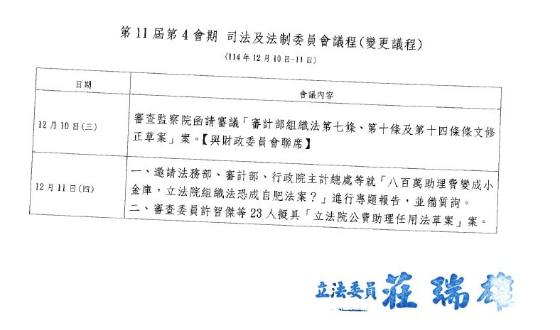 立法院民進黨籍司法委員會召委莊瑞雄傍晚變更週四議程,要求法務部等單位專題報告「八百萬助理費變成小金庫,立法組織法恐成自肥法案?」讀者提供