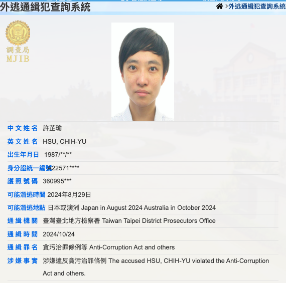 柯文哲貼身幕僚「橘子」許芷瑜被懷疑經手京華城案賄款,目前仍在通緝中。翻攝自法務部調查局網站