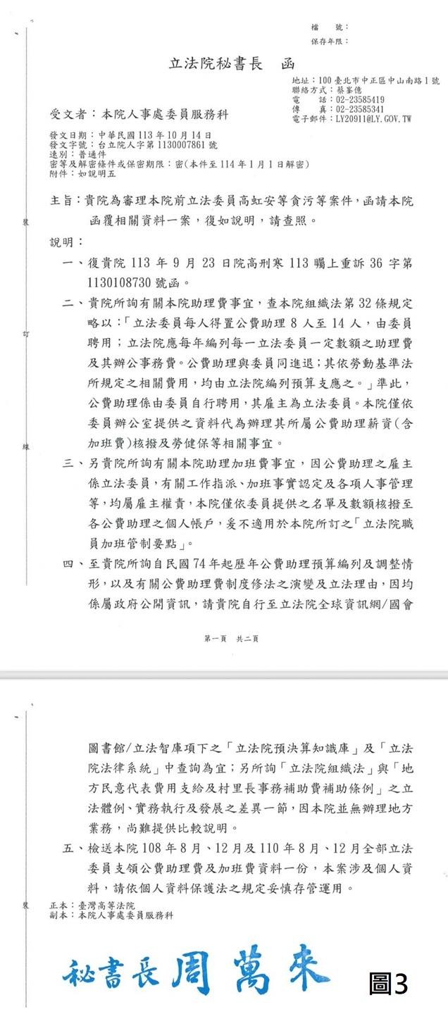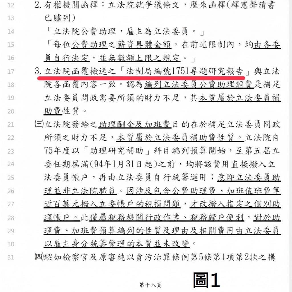 林楚茵PO出立院法制局回函,其中並無高院判決所稱對助理費的相關解釋。翻攝林楚茵臉書