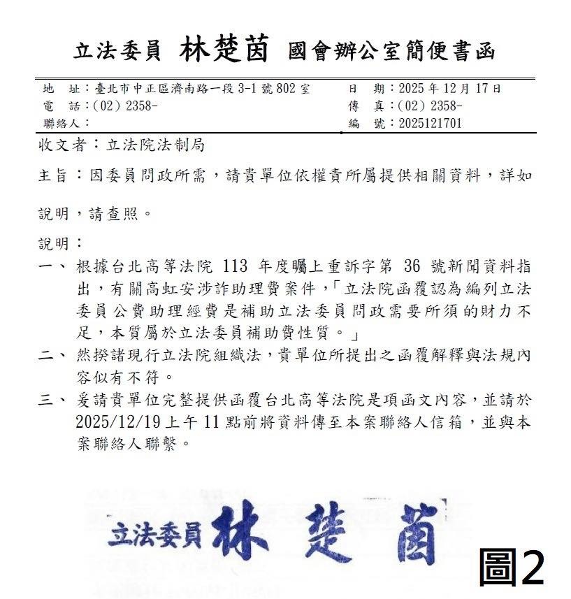新竹市長高虹安助理費案在二審出現大逆轉,高院以立法院回函,指助理費和加班費本質上應屬於「實質補助,彈性勻用」性質改判貪污無罪,僅依公務員登載不實判刑6月得易科罰金。然而,後續卻出現「羅生門」,立院秘書長周萬來回覆高院的公文曝光,卻被發現並無高院所稱內容。對此,民進黨立委林楚茵今(12/19)再度PO出公文質疑:「高院與立法院法制局,到底是誰在說謊?」