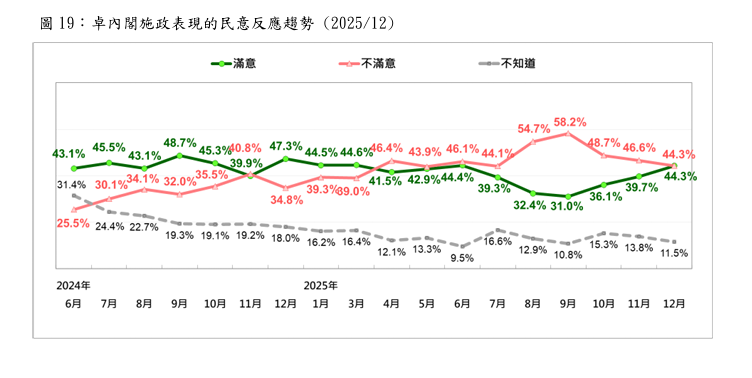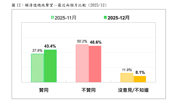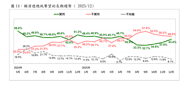 台灣民意基金會(TPOF)今日(12/23)發布最新民調,其中總統賴清德與行政院長卓榮泰的聲望均出現顯著回升,賴清德的贊同率較上月大幅上揚 5.5 個百分點,卓內閣的滿意度更首度與不滿意度呈現「平手」僵局。台灣民意基金會董事長游盈隆指出,儘管賴清德仍未脫離執政困境、國人對卓榮泰內閣的施政好壞也幾乎毫無共識,不過賴清德的聲望正明顯恢復中,而卓榮泰內閣的民意支持度,似乎也有即將破繭而出的跡象。
