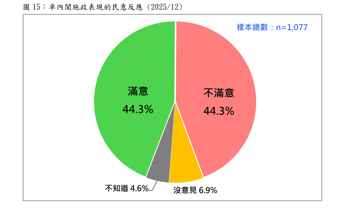 在行政院長卓榮泰領導的內閣表現方面,民意呈現極度分歧的「秋色平分」態勢。針對「行政院長卓榮泰上任已一年七個月,一般說來,您滿意或不滿意他所領導內閣的施政表現?」結果發現有15.1%非常滿意,29.2%還算滿意,21%不太滿意,23.3%非常不滿意,6.9%沒意見,4.6%不知道、拒答。換句話說,最新民意顯示,20歲以上台灣人,滿意度和不滿意度持平。值得注意的是,非常滿意的比率有15.1%,非常不滿意則有23.3%。