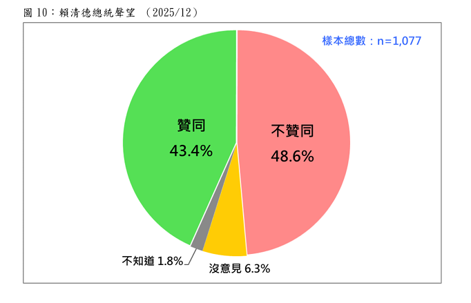 調查說明: 本次調查由台灣民意基金會委託山水民意研究公司執行,訪問期間為 2025 年 12 月 15 日至 17 日,對象為全國 20 歲以上成年人。抽樣採市話(70%)與手機(30%)並用的雙底冊隨機抽樣,有效樣本 1077 人,在 95% 信心水準下,抽樣誤差約正負 2.99 個百分點。