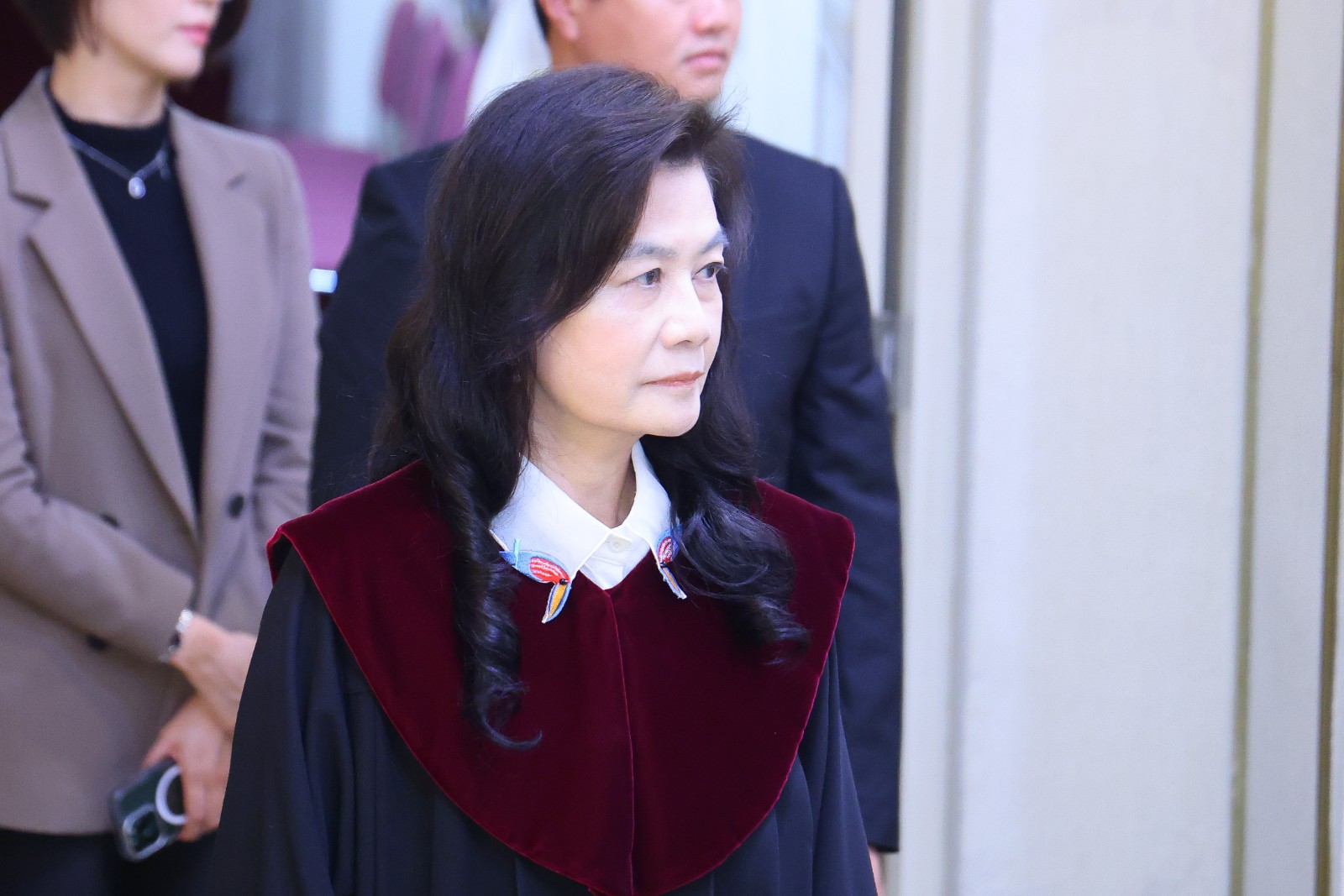7、第95條:113年12月20日修正之條文,自公布日起施行。大法官朱富美(左起)、楊惠欽、蔡宗珍是否會遵守憲法法庭判決,令外界好奇。資料照