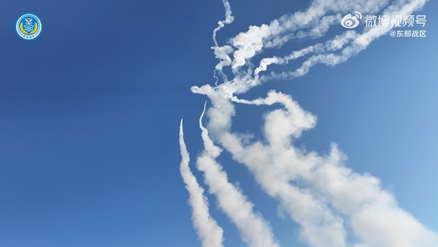 中國解放軍東部戰區2025.12.30對台軍演發射遠程火箭落於台灣24海浬鄰接區內海面。資料照為中方公布畫面,聲稱遠程火力實彈射擊全部命中。翻攝微博