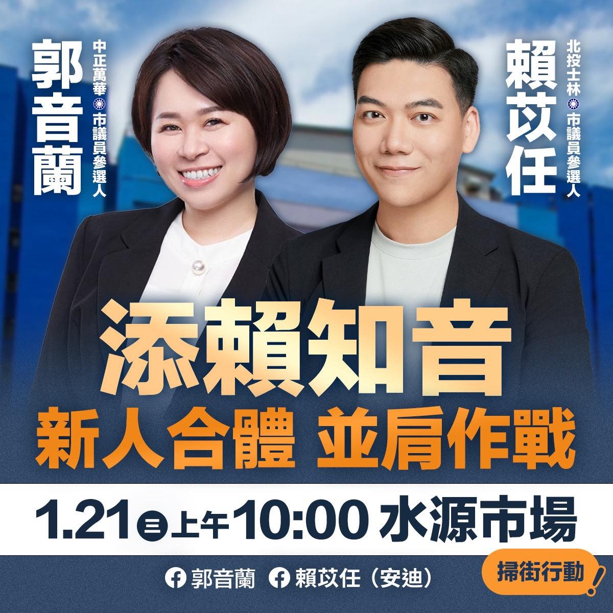表態爭取國民黨提名選中正萬華區市議員的北市府前副發言人郭音蘭今也宣布,明(21日)將由擬選士北區市議員的黨前副發言人賴苡任陪掃水源市場拜票。截自郭音蘭臉書