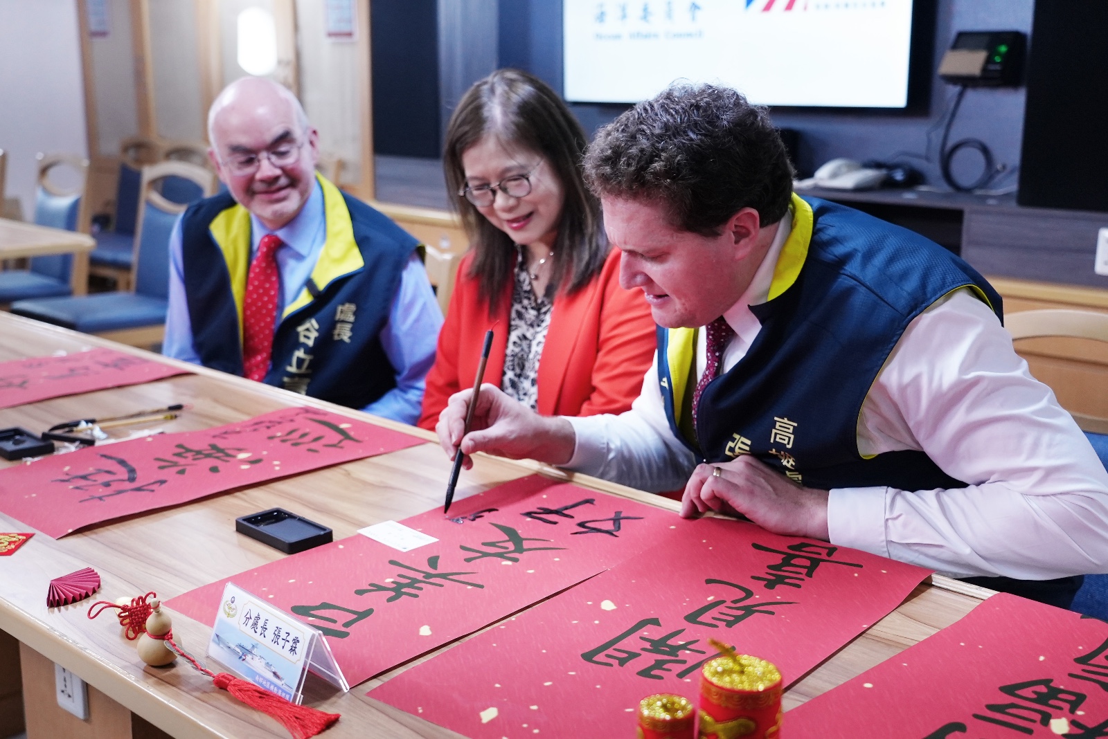 海洋委員會昨天特別邀請美國在台協會(AIT)谷立言處長、AIT高雄分處張子霖分處長登上雲林艦,結合艦名揮毫「雲開見喜」、「林滿福氣」等春聯,將船艦特色轉化為對雲林艦滿滿的新春祝福,筆墨之間不只傳遞吉祥寓意,也藉由書寫台美好「馬」吉春聯,展現出台美雙方最深厚的友誼,管碧玲亦一同落款,象徵台美雙方攜手同行、共同守護海洋的夥伴精神。