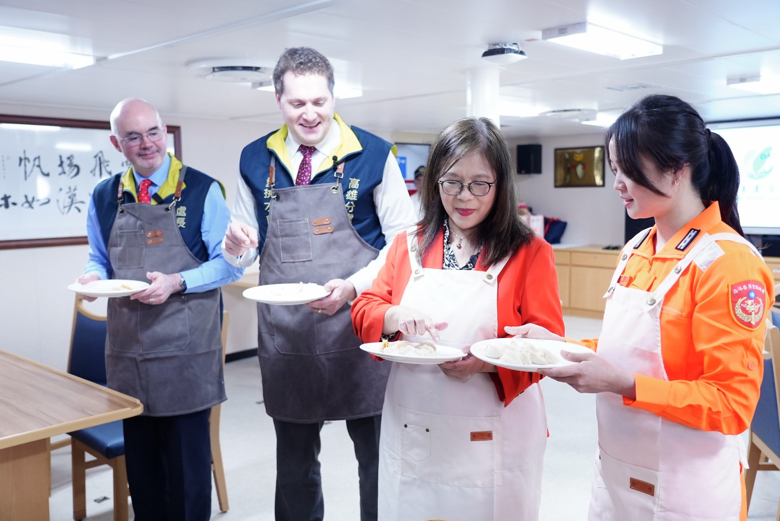海委會主委2026.1.30首度邀請美國在台協會(AIT)處長谷立言、高雄分處長張子霖登上海巡署雲林艦,一同包水餃。海委會提供