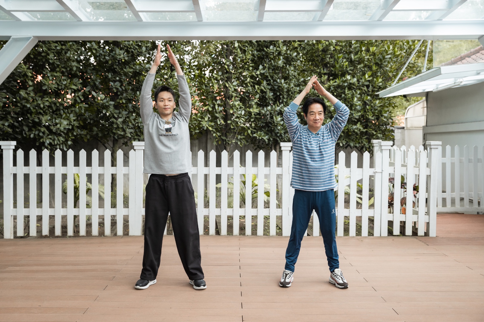 賴清德與李洋換上休閒服裝,一同示範居家健康操,從暖身、伸展、深蹲、單腳站立等動作,訓練身體的活動度、平衡感與核心肌群。李洋提到,這些動作平常可以加壺鈴、啞鈴,「手上沒東西有點怪」,賴清德苦笑:「這是高強度的訓練,對我來講已經很高了」。