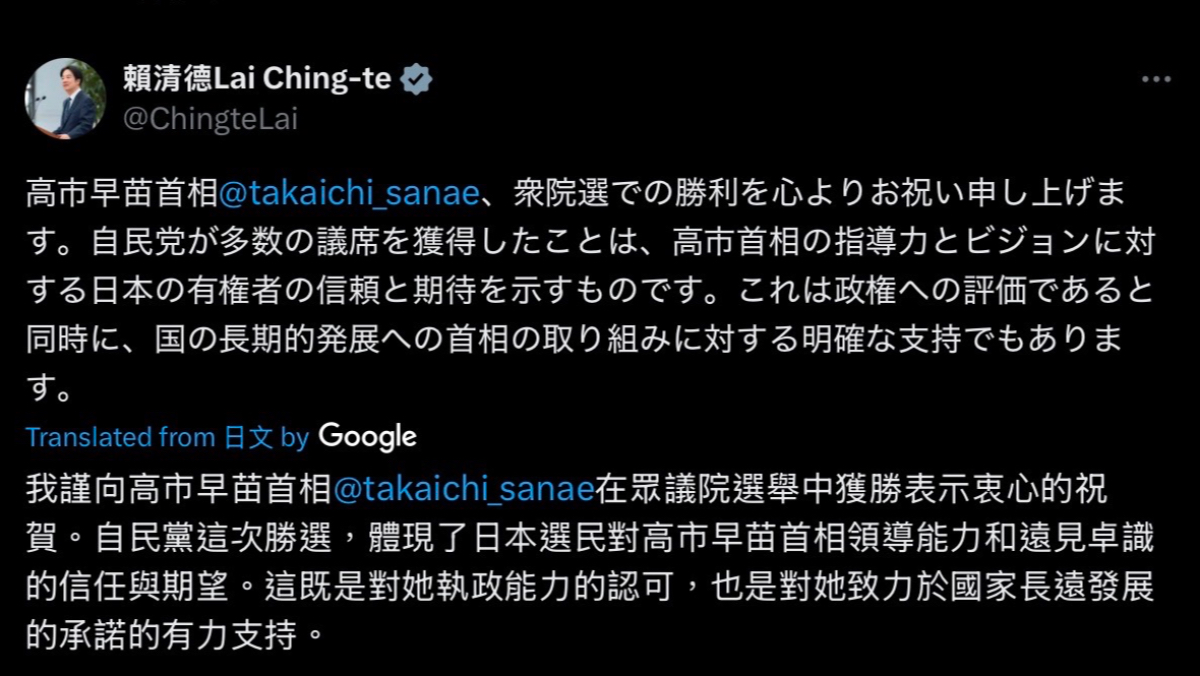 賴清德今晚在X更新發文表示,誠摯恭喜高市早苗在今日大選中取得勝利,自民黨在眾議院選舉中贏得多數席次,彰顯日本選民對您領導力與願景的信任與期待。「這不僅是對執政成果的肯定,更是對您推動國家長遠發展的明確支持。」