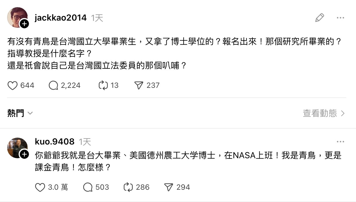 近日有網友在社群平台「Threads」上發文嗆聲,「有沒有青鳥是台灣國立大學畢業生,又拿了博士學位的?報名出來!」沒想到意外釣出台灣人公共事務會會長、美國國家航空暨太空總署(NASA)科學家郭正光博士留言,並反擊「你爺爺我就是台大畢業、美國德州農工大學(Texas A&M University)博士,在NASA上班!我是青鳥,更是課金青鳥!」引發網友熱議。