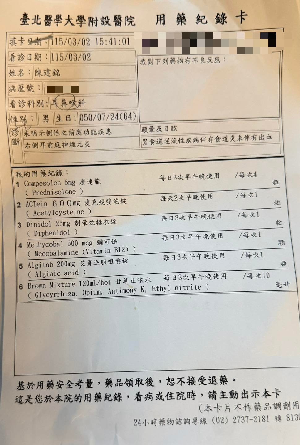陳建銘公布用藥紀錄。翻攝陳建銘臉書