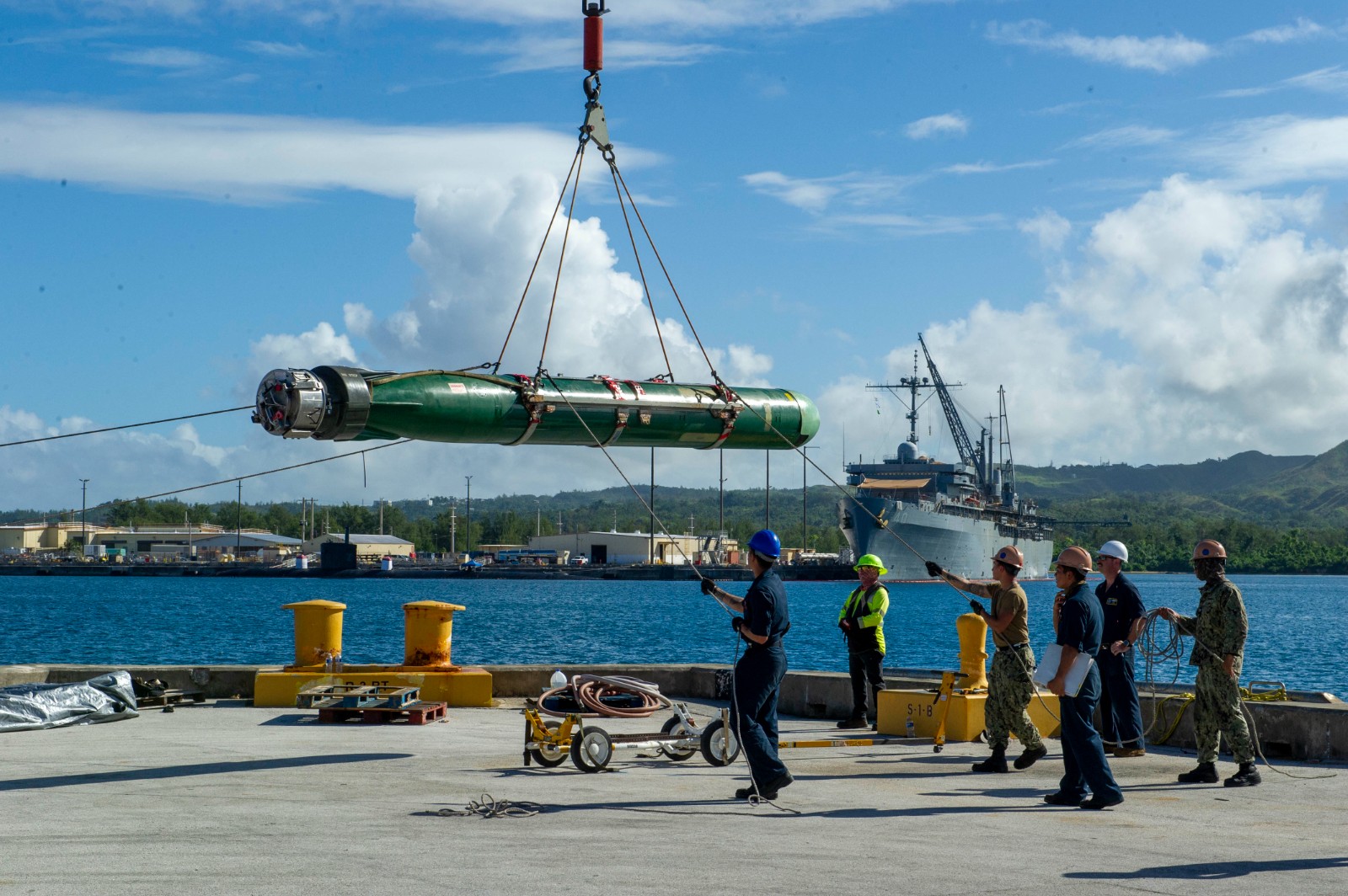 美國海軍洛杉磯級核子攻擊潛艦安納波里斯號(USS Annapolis ,SSN 760)2023.12.05於關島海軍基地北極星點(Polaris Point)碼頭裝填Mk48 魚雷。U.S. Navy