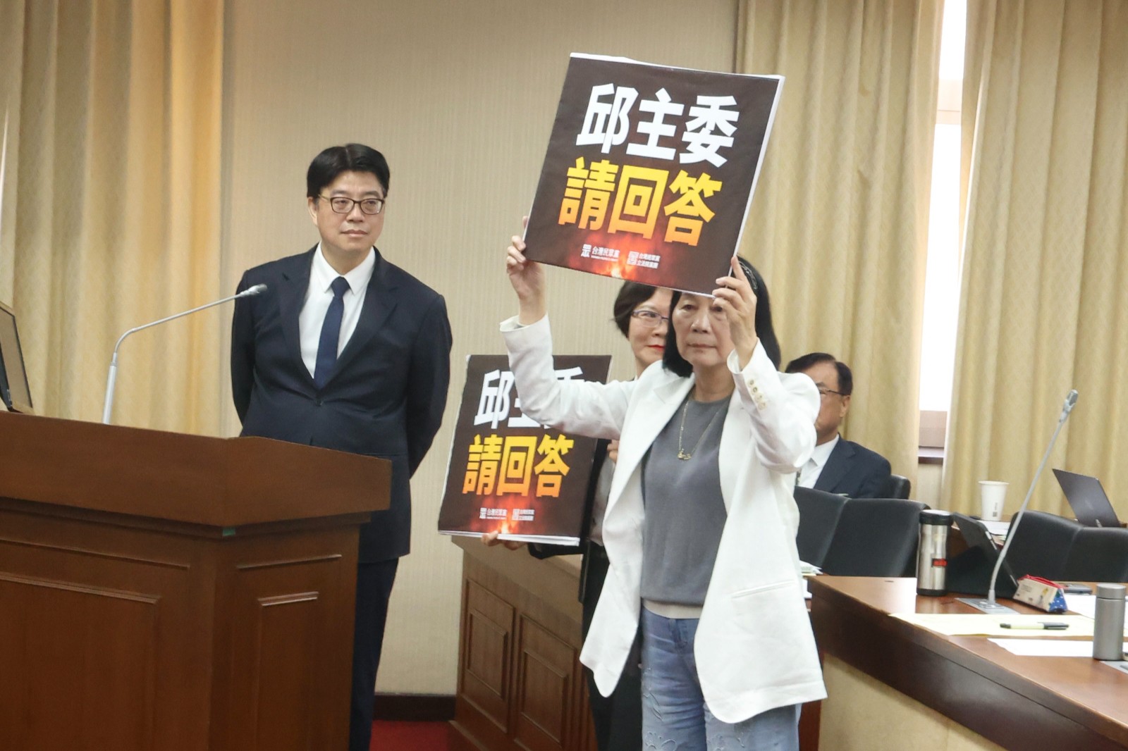隨後,在李貞秀提問後,都由廖先翔復述後,邱垂正則回應「廖召委」,廖先翔遭打趣說是「翻譯機」,為此,民眾黨立委劉書彬一度站到邱垂正旁舉著「邱主委請回答」的牌子,遭到廖先翔制止,民進黨立委黃捷也大喊誇張。