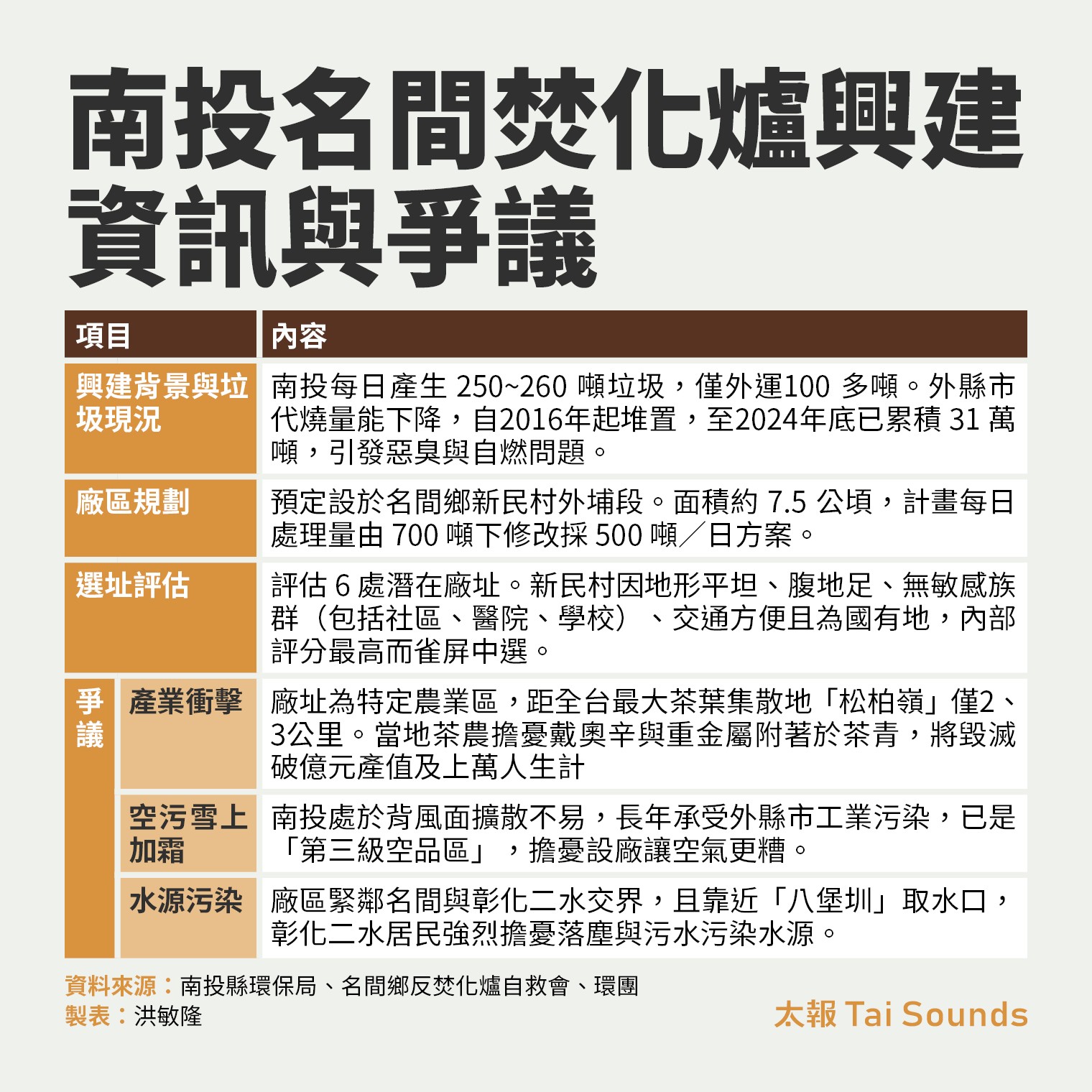 選址引爆怒火:茶鄉生計、空污加劇與水源危機南投縣環保局指出,當初焚化爐選址有針對境內5個鄉鎮市擇定6處潛在廠址進行評估,名間鄉新民村的這塊特定農業區因「地形平坦、腹地充足(逾5公頃)、無敏感族群、交通方便(近交流道且不經過村落)、皆為國有地」等條件而雀屏中選。