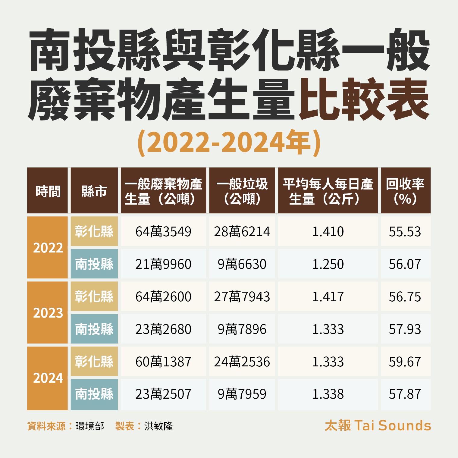 環境部的統計,2022年彰化人均垃圾量1.410公斤,高於南投的1.250公斤,但是2024年,彰化已成功壓低至1.333公斤,南投卻一路飆升至1.338公斤,兩縣市呈現「死亡交叉」,彰化不僅是一般垃圾量兩年內大減4萬多噸,也帶動整體回收率逼近60%,2024年的廚餘回收量也出現顯著成長,從前一年的1.3萬噸躍升至近1.8萬噸;反觀南投的垃圾量卻不減反增,回收率也無法提升。