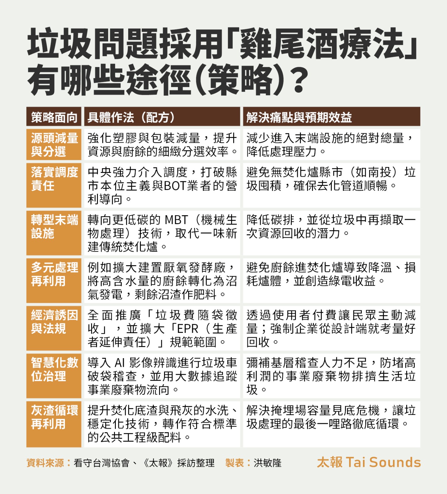 真正的雞尾酒療法:源頭減量才是邁向永續的唯一解方謝和霖認為,所謂垃圾處理的雞尾酒療法,必須是整個廢棄物處理政策的轉型。在中央部分,他呼籲資源重分配,導正公務體系「零廢棄」發展方向,提撥充足預算補助地方建置廚餘及資源回收設施,而非將資源傾注於末端焚化爐。