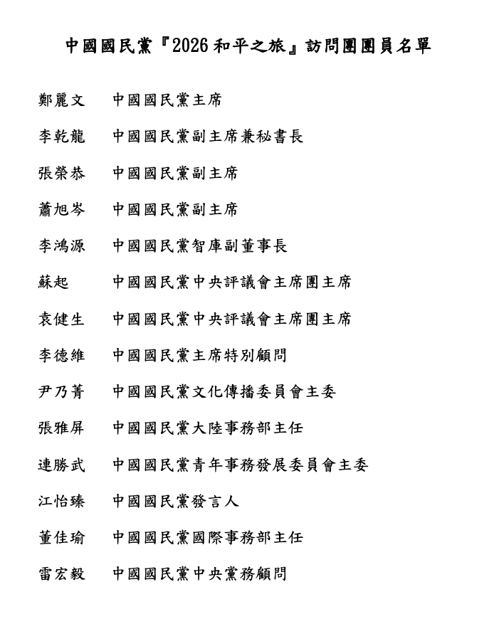 國民黨稍早公布完整隨團13人名單,包括副主席李乾龍、張榮恭、蕭旭岑、智庫副董事長李鴻源、主席特別顧問李德維、中央評議會主席團主席蘇起、袁健生、文化傳播委員會主委尹乃菁、大陸事務部主任張雅屏、青年事務發展委員會主委連勝武、發言人江怡臻、國際事務部主任董佳瑜、中央黨務顧問雷宏毅。
