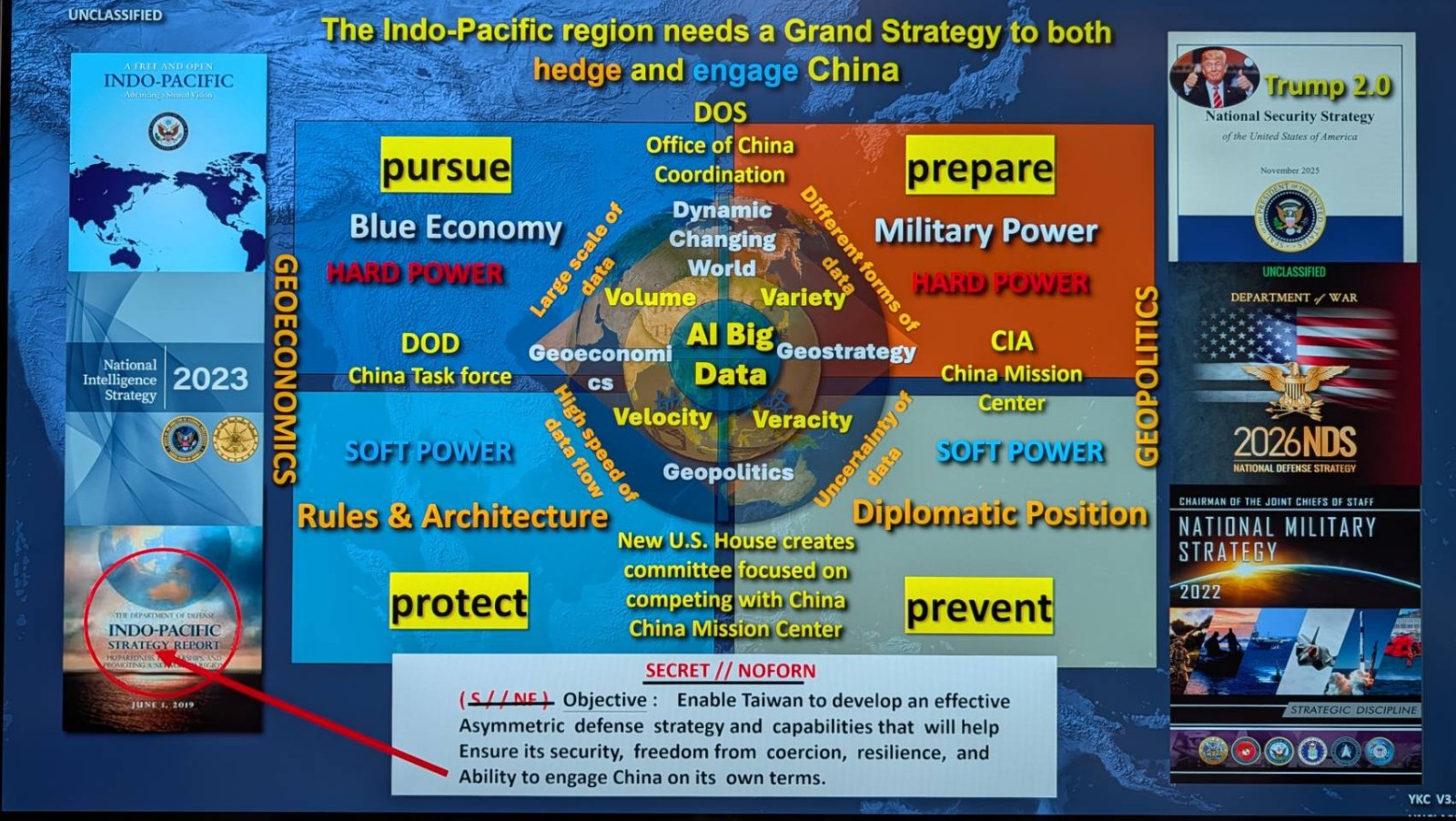 國民黨立委陳永康2026.4.8質詢國安局長蔡明彥,自行製圖分析美國國家安全戰略的組成。 陳永康國會辦公室提供