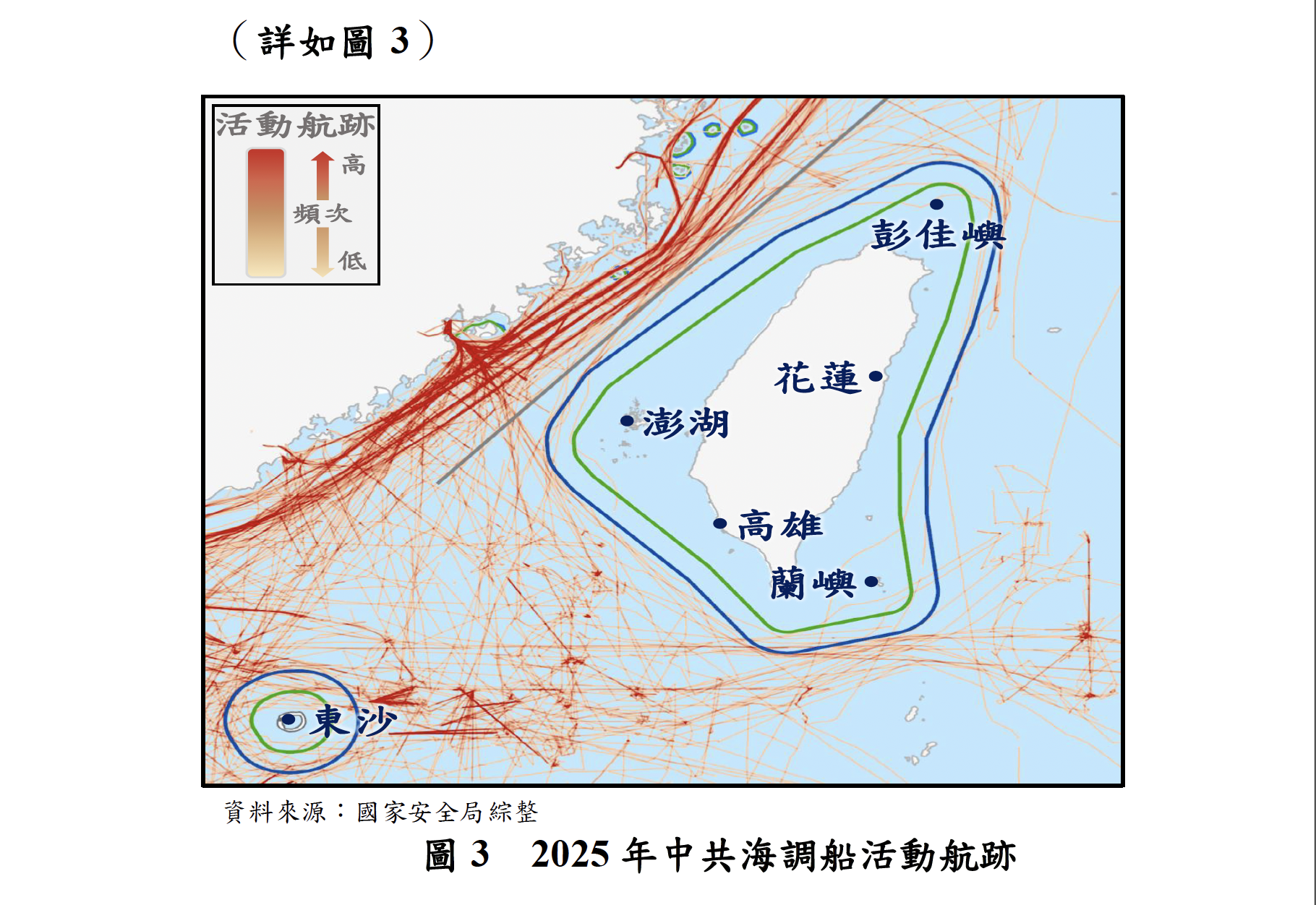 國安局綜合整理2025年中共海調船活動航跡圖。截自國安局報告