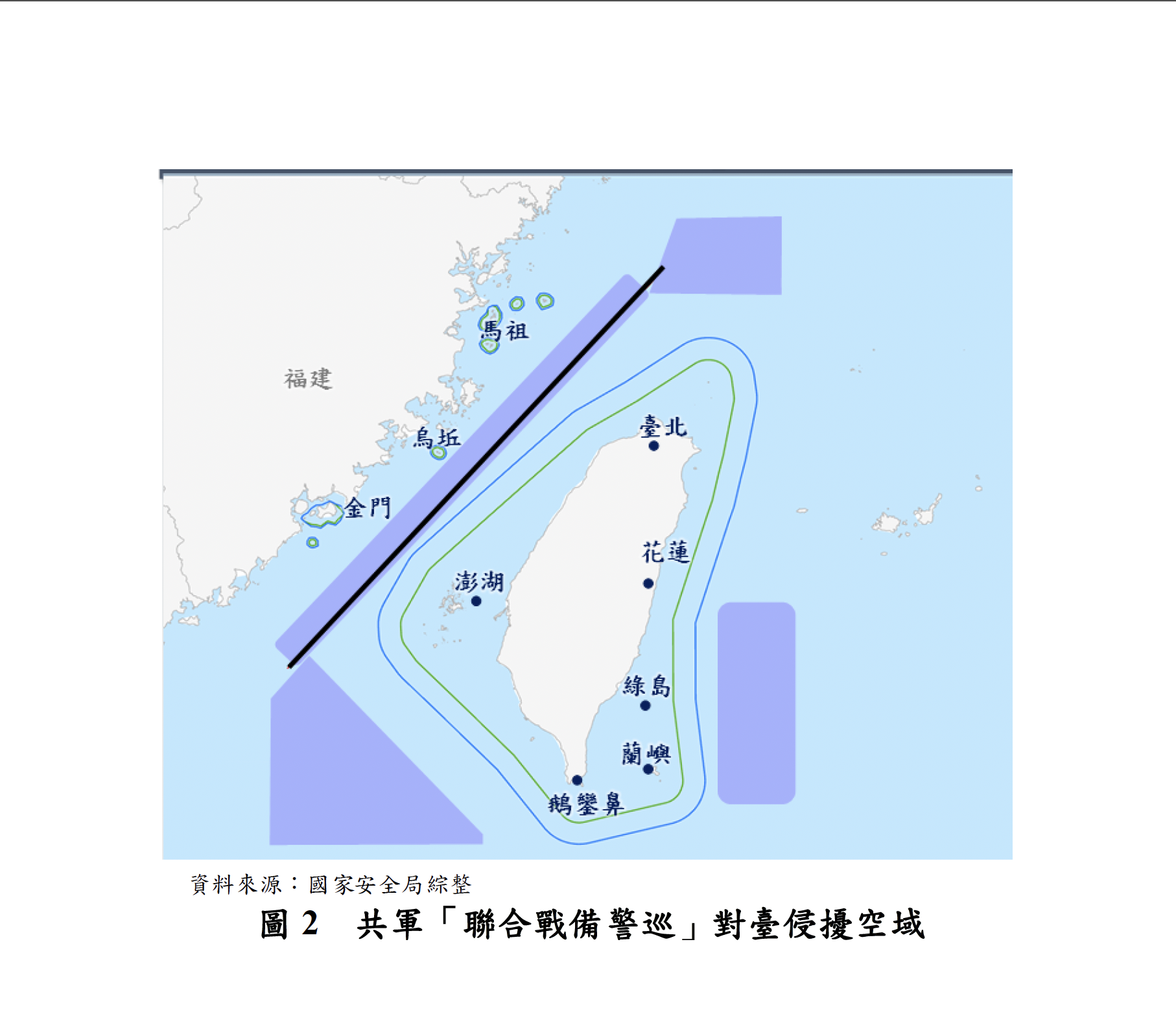 中共解放軍對台持續發動灰色地帶行動,國安局長蔡明彥2026.4.8赴立法院進行業務報告,書面報告中以圖片揭示共軍「聯合戰備警巡」對臺侵擾空域。國安局