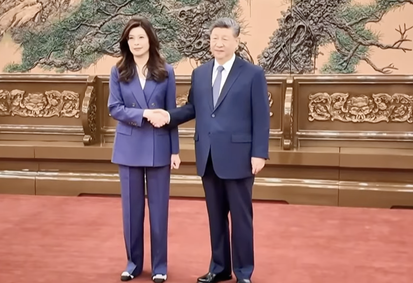 鄭習會今再於北京人民大會堂登場,國民黨主席鄭麗文與中共總書記習近平握手14秒鐘展現友好。國民黨提供