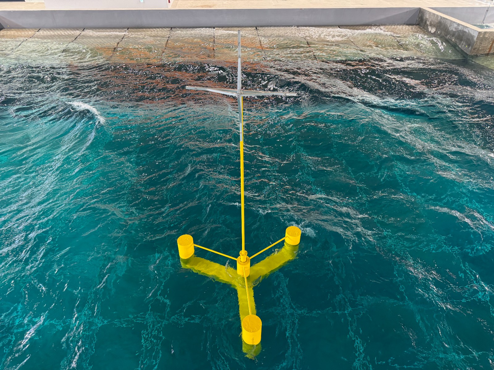 例如測試水池可透過人造規則波、不規則波、聚焦波(俗稱瘋狗浪)來驗證浮式風機模型,在各種波浪下的抗風、抗浪能力。