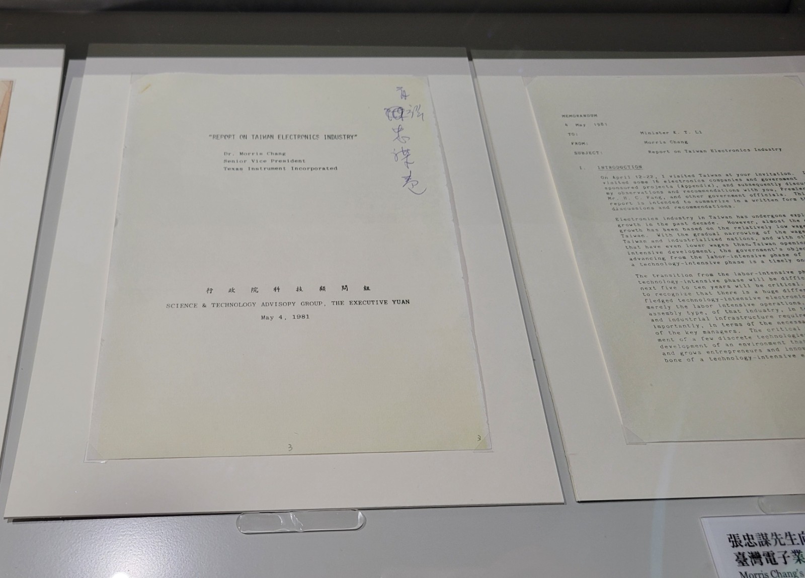 行政院科技顧問組在5月4日收下這份報告,由於收執聯都是英文,負責人員還在上面以中文標註張忠謀的中文名,一開始還把姓氏譯錯,後來才更正為正確的中文名。在這份公文旁,還有《工業技術研究院設置條例》;讓這些相隔超過40年的文件檔案展示在大眾眼前。