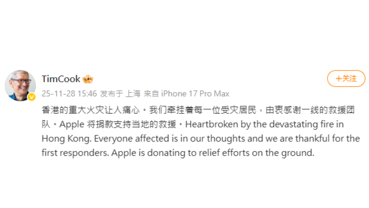 蘋果執行長庫克(Tim Cook)今(11/28)日透過微博以中英文發文,表示香港的重大火災令人痛心,並強調「牽掛著每一位受災居民」,同時向第一線救援人員致上謝意,肯定他們在惡劣環境中奮力搶救生命的付出。
